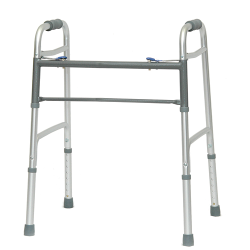 Sold by 2 in a Case. * ProBasics Bariatric Two-Button Release Folding Walkers provide maximum strength and a rugged design all backed by a limited lifetime warranty. * Ample height adjustment options coupled with a two-button folding mechanism make ProBasics Folding Walkers easy to use and accommodating to the most demanding patient needs. * Support patient weights up to 500 pounds. * Attractive lightweight aluminum frame. * Adjustable height settings. * Easy-to-use push button folding mechanism provides audible click when locked. * Front cross brace near top of walker allows for full stride. * Each side operates independently to allow easy movement through narrow spaces and greater stability while standing. * Vinyl contoured hand grip for added comfort and long lasting wear. * Folds flat for transport and storage. * SPECIFICATIONS: Width Inside Hand Grips: 21.5 Width Inside Base Legs: 32 Depth Opened at Base 20 Depth Folded: 4.5 Patient Height Range: Adult: 5?2 – 6?4 Weight Capacity: 500 lb Product Weight: W/out wheels: 7.3 lb. Warranty: Limited lifetime on frame One year on all parts