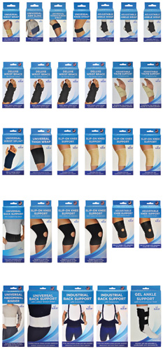 60 piece unit * Containing the following items: BJ215231 2 SM 2 MD 2 LG 2 XL Blue Jay Slip-On Knee Support Beige BJ215320 2 Univ Blue Jay Univ Back Support w/Lumbar Tension Straps-White BJ215300 2 Blue Jay Back Support with Supporting Stays Universal Blk BJ215311 2SM/MD 2 LG/XL Blue Jay Industrial Back Suppt w/Suspenders BJ210300 2 Blue Jay Abdominal Binder Universal White BJ215400 2 Blue Jay Universal Arm Sling with Shoulder Comfort Pad-Blue BJ215201 2 SM 2 MD 2 LG Blue Jay Slip-On Knee Support Open Patella w/Stabilizers BJ215221 2 SM/MD 2 LG/XL Blue Jay Adj Knee Support Open Patella Design Black BJ215210 2 Blue Jay Universal Knee Strap Black BJ215280 2 Blue Jay Universal Thigh Wrap Black BJ215430 2 Blue Jay Tennis Elbow Strap Universal Black BJ215451 2 SML 2SMR 2LXL 2LXLR Blue Jay Dlx Wrist Brace Black for Carpal Tunnel BJ215460 2 Blue Jay Wrist Splint Black Universal BJ215470 2 Blue Jay Universal Wrist Wrap Beige BJ215481 2 SM / MD 2 LG/XL Blue Jay Adj Thumb Support w/Stabilizing Stay Beige BJ215100 2 Blue Jay Universal Gel Ankle Support w/ Hard Exterior Shell BJ215131 2 SM 2 MD 2 LG Blue Jay Adjustable Ankle Wrap Black The BJORTH Is 24 wide and 52 high