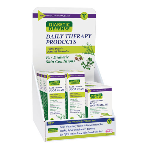 This display contains the following: 5#P3076 Diabetic Defense Daily Therapy Foot Wash 5.1 oz bottle & 3#P3620 Diabetic Defense© Daily Therapy Foot Moisturizer 4 oz.