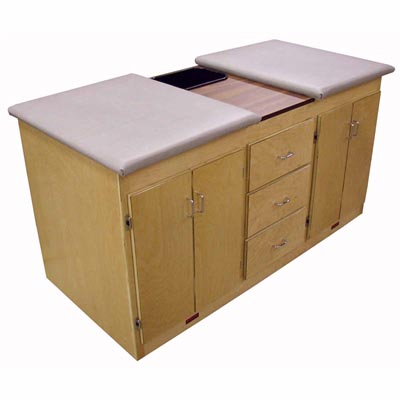 Height choices: 36 or 42 . * Thick vinyl upholstery in US 393 Black standard with your choice of optional Bailey upholstery colors and either Natural or Dark Walnut wood finishes. * Full depth adjustable interior shelf and triple drawers. * Spacious 28 quart wastebin standard. * Options include Locks and special laminated tops. * Taping Top Dimensions: 26 wide x 32 deep. * Cabinet footprint: 30 deep x 66 wide. * Finished all around; use freestanding as an island. * Two units can form a 2 + 2 island. * Weight capacity 500 lb. * Ship weight 450 lb.