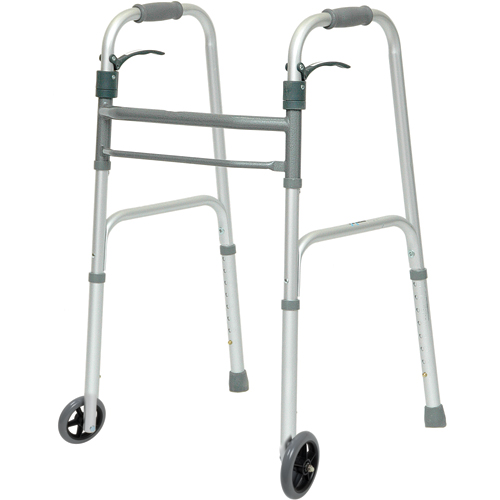 ProBasics Sure Lever Release Folding Walker with 5 Wheels (Adult)Adult size with 5 wheels. 350 lb weight capacity. The ProBasics Sure Lever Release Walker is an ideal design for patients with manual dexterity limitations. The sure lever release folding mechanism allows users to close the walker without removing their hands from the walker handle. Ample height adjustment options coupled with a sure lever release folding mechanism make it easy to use and accommodating to the most demanding patient needs. Supports patient weights up to 350 pounds.Attractive lightweight aluminum frame Sure lever release folding mechanism allows users to close the walker without removing their hands from the walker handle Each side operates independently to allow easy movement through narrow spaces and greater stability while standing Front cross brace near top of walker allows for full stride Adjustable height settings Vinyl contoured hand grip for added comfort and long lasting wear Rear glide cap allows for walker to slide easily and smoothly over most surfaces (come standard on models with 5 wheels) Folds flat for transport and storage HCPCS* Code: E0143 (with wheels)