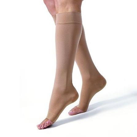 Knee High (Open Toe) * Beige * 20-30 mmHg * Large * Ankle Circ. 10 – 11 3/8 * Calf Circ 12 1/2 – 18 1/8 * Affordable gradient compression hosiery * When managed care reimbursement limits product selection choices Jobst Relief hosiery delivers compression therapy at an affordable price * Available in knee thigh and waist styles * Accurate gradient compression therapy at a price patients can afford * 3-D knit structure using air covered spandex yarn that is soft to touch and comfortable for all day wear * Reinforced heel designed for long-lasting durability * Relief is appropriate for use by both men and women * Latex free
