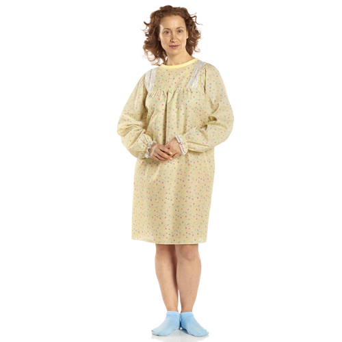 Long Sleeve * Yellow Floral * Lace trimmed yoke puckered sleeves and a gently fitted bustline * Practical wrap-around design with snap closures * One size fits all * One gown per package *