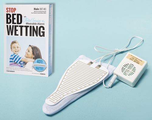 MALE ALARM WITH PADS * Compact moisture-sensitive training device for bedwetters * Small plastic alarm box attaches to shoulder area of the bedwetters pajama or t-shirt with velcro attachment close to the ear * Nonabsorbent anatomically designed sensor pad is worn over the genitals and held in place with a pair of snug fitting shorts or panties * Plastic box contains miniaturized electronic alarm and a 9V battery * Alarm box generates a highly alerting warbling sound assuring quicker response to the alarm by the bedwetter * Alarm box has built-in dual-volume control switch for high tone or low tone. Only alarm available with volume control switch * Unique moisture-sensing pad is activated by only 1 or 2 drops of urine. Quickest response among all bedwetting alarms available * Comes with 2 long-lasting reusable moisture sensing pads Shipping Carton Size: 12 L x 10 W x 6 H