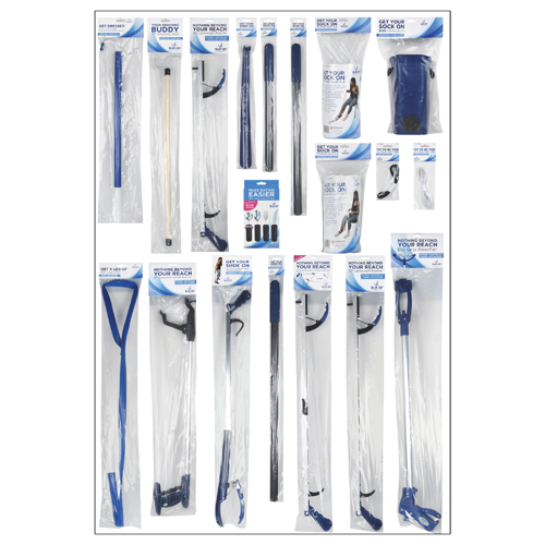 4 foot section with 19 facings and 91 total skus * Includes 4 of each of the following items: BJ100100 Get Your Sock On Formed Sock Aid BJ100101 Get Your Sock On Flexible Sock Aid BJ100103 Get Your Sock On Formed Sock Aid Wide BJ100210 Make Eating Easier Big Grip Utensil Set Includes 5 of each of the following items: BJ100110 Your Dressing Buddy 27 Dressing Stick BJ100130 Fit To Be Tied 24 Elastic Shoe Laces Black BJ100131 Fit To Be Tied 24 Elastic Shoe Laces White BJ100140 2-in-1 Long Handle Dressing Aid with Shoehorn BJ100144 Get Your Shoe On 18 Metal Shoehorn BJ100145 Get Your Shoe On 24 Metal Shoehorn BJ100146 Get Your Shoe On Metal Shoehorn 30 Long BJ100147 Get Your Shoe On 18 Plastic Shoehorn BJ100150 Nothing Beyond Your Reach 26 Lightweight Reacher BJ100151 Nothing Beyond Your Reach 32 Lightweight Reacher BJ100153 Nothing Beyond Your Reach 32 Lightweight Folding Reacher BJ100158 Nothing Beyond Your Reach 30 Ergonomic Handle Reacher BJ100159 Nothing Beyond Your Reach 30 Big Grip Large Mouth Reacher BJ100160 Get Your Shoe On 32 X-Long Shoehorn & Shoe Gripper BJ100170 Get A Leg Up Leg Lifter 40.5 Navy