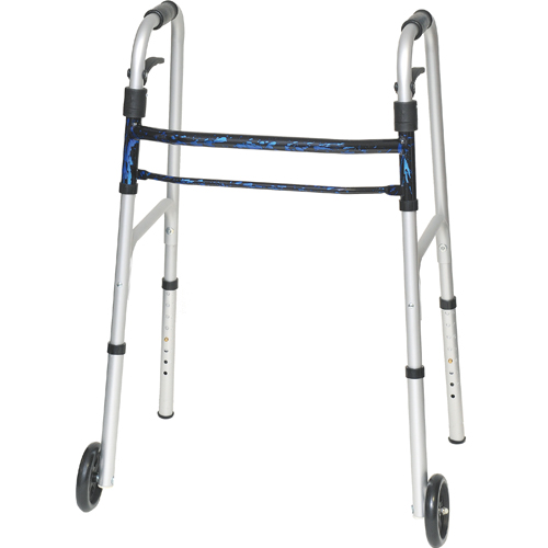 ProBasics Sure Lever Release Folding Walker with 5 Wheels and Blue Flame Finish (Adult). Adult size with 5 wheels Stylish blue flame finish 350 lb weight capacity Sold 4//cs The ProBasics Sure Lever Release Walker is an ideal design for patients with manual dexterity limitations. The sure lever release folding mechanism allows users to close the walker without removing their hands from the walker handle. Ample height adjustment options coupled with a sure lever release folding mechanism make it easy to use and accommodating to the most demanding patient needs. Supports patient weights up to 350 pounds. Attractive lightweight aluminum frame Sure lever release folding mechanism allows users to close the walker without removing their hands from the walker handle Each side operates independently to allow easy movement through narrow spaces and greater stability while standing Front cross brace near top of walker allows for full stride Adjustable height settings Vinyl contoured hand grip for added comfort and long lasting wear Rear glide cap allows for walker to slide easily and smoothly over most surfaces (come standard on models with 5 wheels) Folds flat for transport and storage HCPCS* Code: E0135 (without wheels) | E0143 (with wheels)
