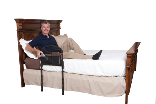 Extendable Legs – Provides added stability when standing up * Ergonomic Cushion Handle – Allows for easy transfer in and out of bed * 4-Pocket Organizer – Provides storage space for handy items * Anti-Slip Grips – Secures rail in-between mattress and bed frame * Height Adjustment – Accommodates any home or hospital bed * Easy Installation – Installs in seconds with no tools required * Depth of horizontal support structure under mattress: 20 * Weight capacity: 300 lbs * Weight of product: 9 lbs * Steel frame with durable powder coat finish