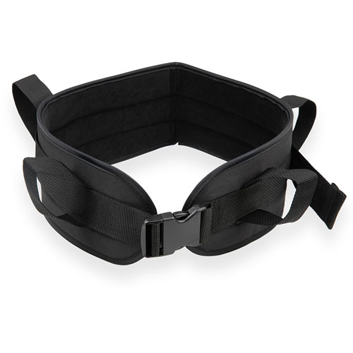 Padded transfer belt plastic side release buckle large black * Padded transfer belts assist patient transfers * Allows for the comfort and dignity of patient as well as safety for both patient and caregiver * Pads are 6 wide with four handle loops spaced for safe grip points * Sizes color-coded for quick identification in a rehab department * Dimensions: 40-64 x 6 x 1
