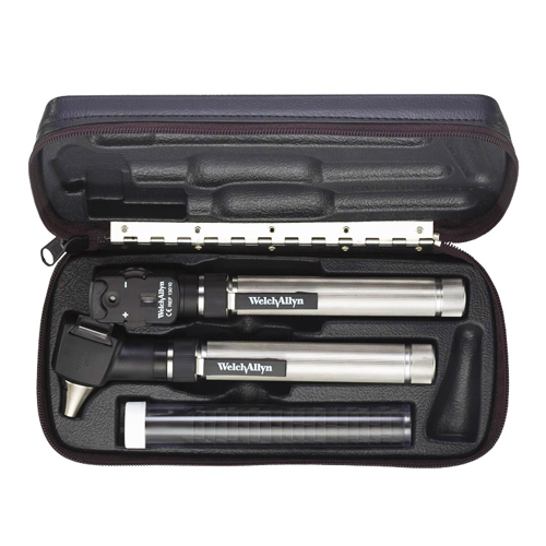 Comes in a hard fitted case * 2.5V Otoscope also has built in throat illuminator – two in one instrument * Features halogen illumination and fiber optics for a cool light with no reflections or obstructions plus a rectangular viewing lens for instrumentation under magnification * 2.5V PocketScope handle has a smooth rheostat to control light intensity and features a handy pocket clip *